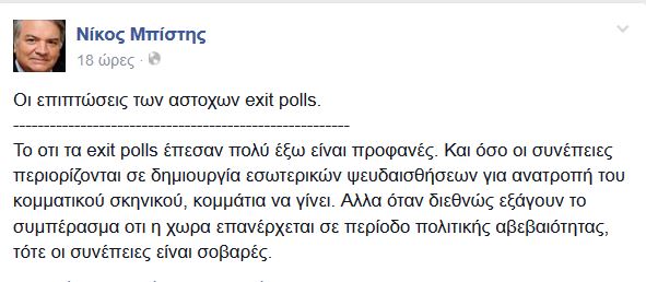 “Το ότι τα exit poll έπεσαν πολύ έξω είναι προφανές. Και όσο οι συνέπειες περιορίζονται σε δημιουργία εσωτερικών ψευδαισθήσεων για ανατροπή του κομματικού σκηνικού, κομμάτια να γίνει. Αλλα όταν διεθνώς εξάγουν το συμπέρασμα οτι η χωρα επανέρχεται σε περίοδο πολιτικής αβεβαιότητας, τότε οι συνέπειες είναι σοβαρές” έγραψε ο κ. Μπίστης.
