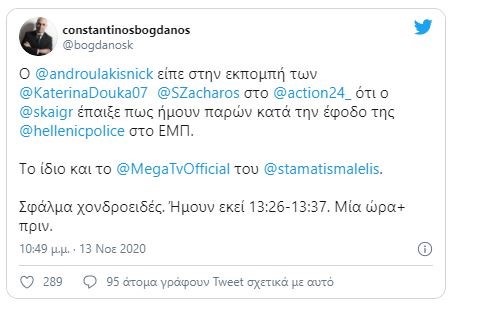 Στα δημοσιεύματα και τις αντιδράσεις κομμάτων της αντιπολίτευσης που ανέφεραν ότι παρευρέθηκε στην επιχείρηση εκκένωσης του Πολυτεχνείου απάντησε με δύο αναρτήσεις στον λογαριασμό του στο Twitter ο Κωνσταντίνος Μπογδάνος.