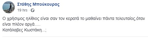 “Ο χρήσιμος ηλίθιος είναι σαν τον κερατά το μαθαίνει πάντα τελευταίος, όταν είναι πλέον αργά. Κατάλαβες Κωστάκη…;” έγραψε.