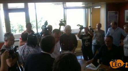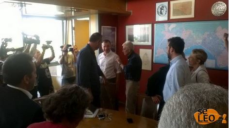 Λίγο πριν από τη συνέντευξη τύπου στη ΔΕΘ, ο επικεφαλής του Ποταμιού, Σταύρος Θεοδωράκης πέρασε από το δημαρχιακό μέγαρο της πόλης.