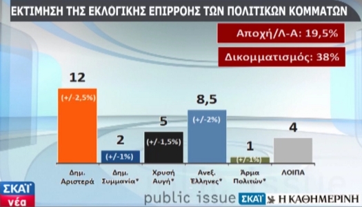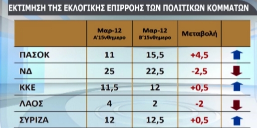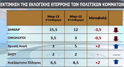 Στην εκτίμηση ψήφου η ΝΔ συγκεντρώνει 22,5%, το ΠΑΣΟΚ 15,5%, ο ΣΥΡΙΖΑ 12,5%, το ΚΚΕ και η Δημοκρατική Αριστερά 12%, οι Ανεξάρτητοι Έλληνες 8,5%, η Χρυσή Αυγή 5% και οι Οικολόγοι 3%.