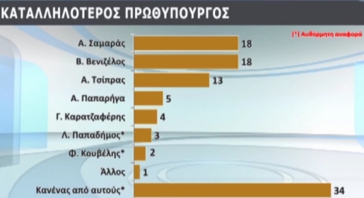 Στην καταλληλότητα για την Πρωθυπουργία το αποτέλεσμα μεταξύ του Α. Σαμαρά και του Ευ. Βενιζέλου είναι ισόπαλο, ενώ πάντα προηγείται ο κανένας.