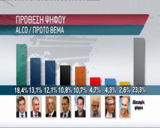 Περίπου ίδια εικόνα παρουσιάζεται και στην δημοσκόπηση της ALCO για το Πρώτο Θέμα. Ο Γ. Καμίνης συγκεντρώνει 18.4% και ακολουθούν Α. Σπηλιωτόπουλος 13.1% Ν. Κακλαμάνης 12.1% Κασιδιάρης 10.8% Γ. Σακελλαρίδης 10.7% Ν. Σοφιανός 4.7% Β. Καπερνάρος 4.3% Γ. Αμυράς 2.6% ενώ η αδιευκρίνιστη ψήφος φτάνει το 16.5%