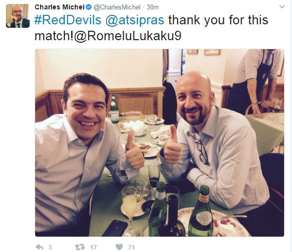 Ικανοποιημένοι φαίνεται ότι έμειναν από την ισοπαλία 1-1 ανάμεσα στο Βέλγιο και την Ελλάδα ο Αλέξης Τσίπρας και ο Πρωθυπουργός των οικοδεσποτών της αναμέτρησης, Σαρλ Μισέλ, οι οποίοι παρακολούθησαν μαζί την αναμέτρηση στη Ρώμη.Αμφότεροι σε φωτογραφία που ανήρτησε στο προφίλ του ο Βέλγος Πρωθυπουργός ήταν ευδιάθετοι με ένα χαμόγελο με τον κ. Μισέλ να γράφει στη λεζάντα της φωτογραφίας: «Αλέξη Τσίπρα σε ευχαριστώ για αυτό το ματς». Και, βέβαια, να μην ξεχνά να αποθεώνει τον Ρομέλου Λουκάκου, ο οποίος σκόραρε στο 89’ και χάρισε το βαθμό της ισοπαλίας στην Εθνική ομάδα της χώρας του.Δείτε το tweet: