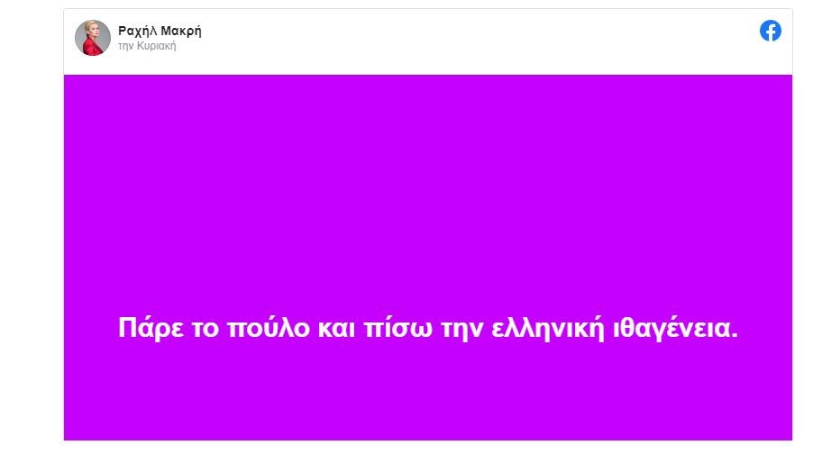 Θύελλα αντιδράσεων έχει προκαλέσει μια χυδαία ανάρτηση που έκανε στο Facebook η πρώην βουλευτής των ΑΝ.ΕΛ και του ΣΥΡΙΖΑ, Ραχήλ Μακρή. «Πάρε το π… και πίσω την ελληνική ιθαγένεια», έγραψε η Ραχήλ Μακρή, αναφερόμενη εμμέσως πλην σαφώς στον Γιάννη Αντετοκούνμπο, παρότι δεν τον κατονομάζει.