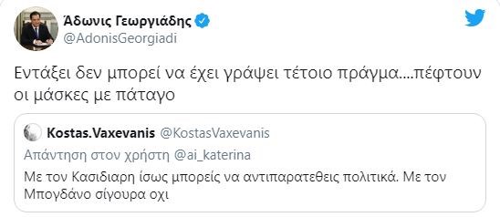 Ο υπουργός Ανάπτυξης Άδωνις Γεωργιάδης σχολίασε την ανάρτηση Βαξεβάνη, γράφοντας: “Εντάξει δεν μπορεί να έχει γράψει τέτοιο πράγμα… πέφτουν οι μάσκες με πάταγο”.