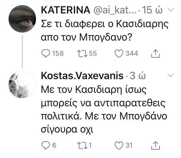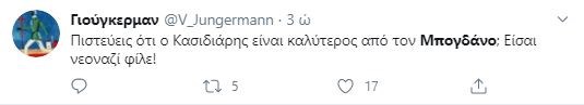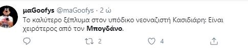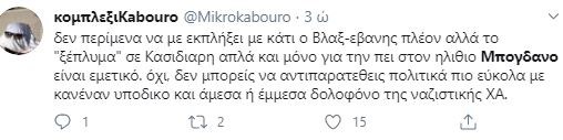 Σε διαδικτυακό διάλογο με χρήστη του Twitter, ο δημοσιογράφος ανέφερε ότι “με τον Κασιδιάρη ίσως μπορείς να αντιπαρατεθείς πολιτικά, με τον Μπογδάνο σίγουρα όχι”.