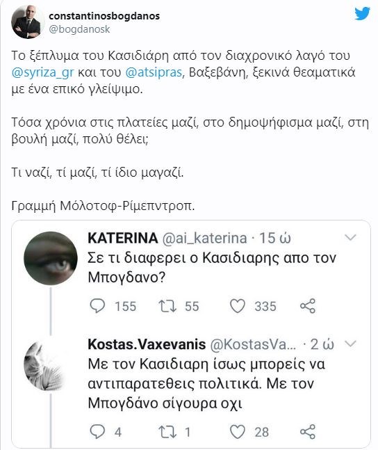 Έντονη ήταν η αντίδραση και του ίδιου του Κωνσταντίνου Μπογδάνου. “Το ξέπλυμα του Κασιδιάρη από τον διαχρονικό λαγό του ΣΥΡΙΖΑ και του Τσίπρα, Βαξεβάνη, ξεκινά θεαματικά με ένα επικό γλείψιμο. Τόσα χρόνια στις πλατείες μαζί, στο δημοψήφισμα μαζί, στη βουλή μαζί, πολύ θέλει; Τι ναζί, τι μαζί, το ίδιο μαγαζί. Γραμμή Μόλοτοφ-Ρίμπεντροπ”, έγραψε ο βουλευτής της ΝΔ.