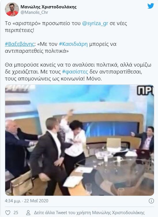 Την ανάρτηση του δημοσιογράφου στα social media σχολίασε και ο γραμματέας του ΚΙΝΑΛ, Μανώλης Χριστοδουλάκης. “Το ‘αριστερό’ προσωπείο του ΣΥΡΙΖΑ σε νέες περιπέτειες! Βαξεβάνης: ‘Με τον Κασιδιάρη μπορείς να αντιπαρατεθείς πολιτικά’. Θα μπορούσε κανείς να το αναλύσει πολιτικά, αλλά νομίζω δε χρειάζεται. Με τους φασίστες δεν αντιπαρατίθεσαι, τους απομονώνεις ως κοινωνία! Μόνο’”, έγραψε στο Twitter.