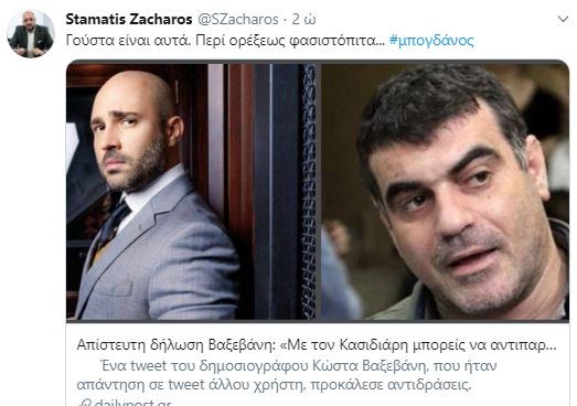 Σε διαδικτυακό διάλογο με χρήστη του Twitter, ο δημοσιογράφος ανέφερε ότι “με τον Κασιδιάρη ίσως μπορείς να αντιπαρατεθείς πολιτικά, με τον Μπογδάνο σίγουρα όχι”.