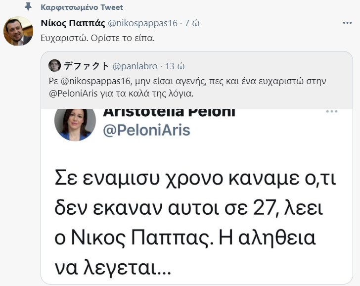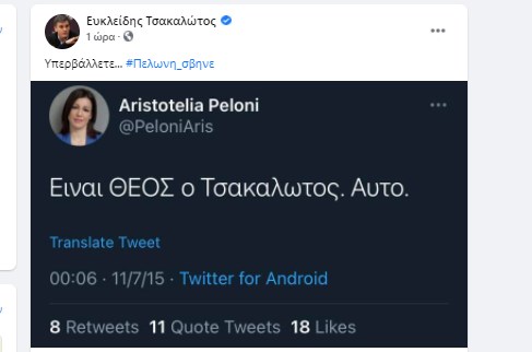 Κάποια όμως tweets της κ. Πελώνη αφορούσαν και στον ΣΥΡΙΖΑ και τα στελέχη του. Σε ένα από αυτά, το 2015 έγραφε: “Είναι Θεός ο Τσακαλώτος. Αυτό”. Γνωστός για το χιούμορ του ο κ. Τσακαλώτος, το ανέβασε στους λογαριασμούς του στα social media και σχολίασε με χιούμορ: “Υπερβάλλετε…”. Στο ίδιο μήκος κύματος και το tweet του Νίκου Παππά, στον οποίο επίσης είχε αναφερθεί με ανάρτησή της.