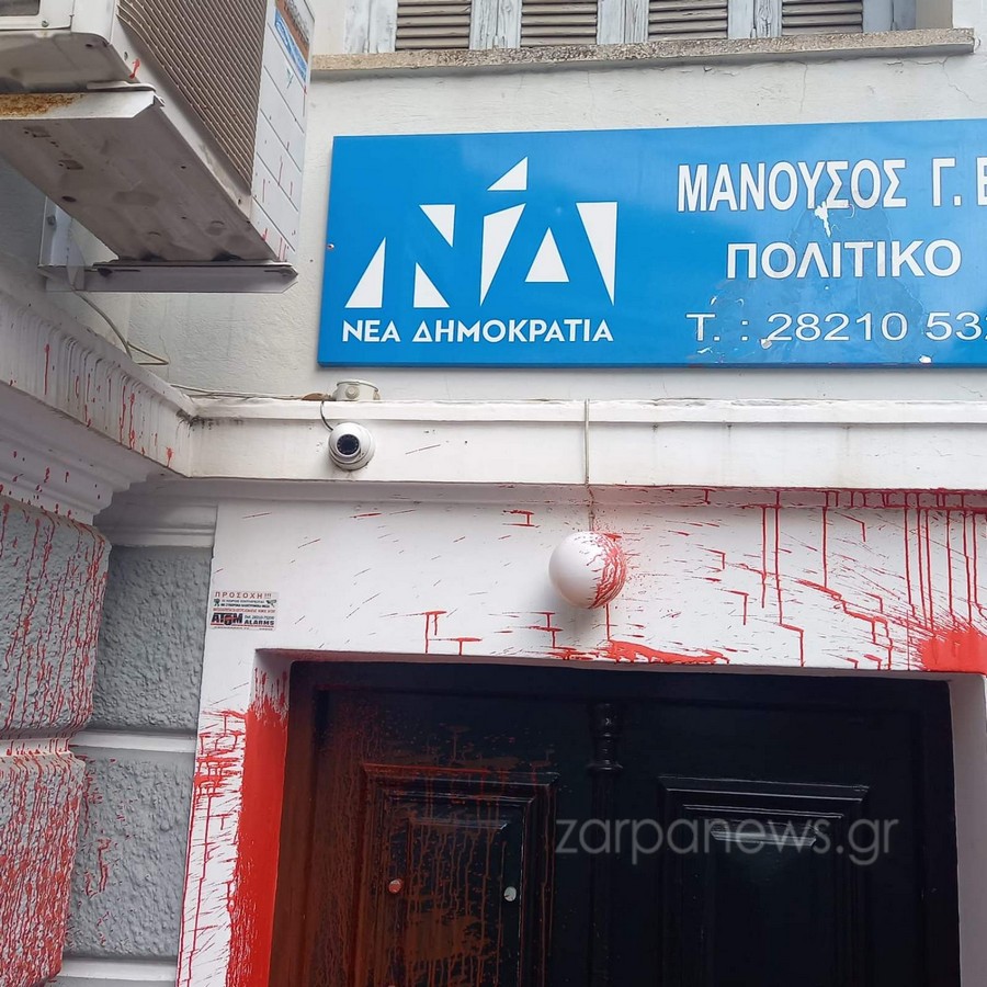 Άγνωστοι έριξαν μπογιές στο πολιτικό γραφείο της βουλευτή Χανίων της Νέας Δημοκρατίας, Σέβης Βολουδάκη, τα ξημερώματα της Δευτέρας (24/02).