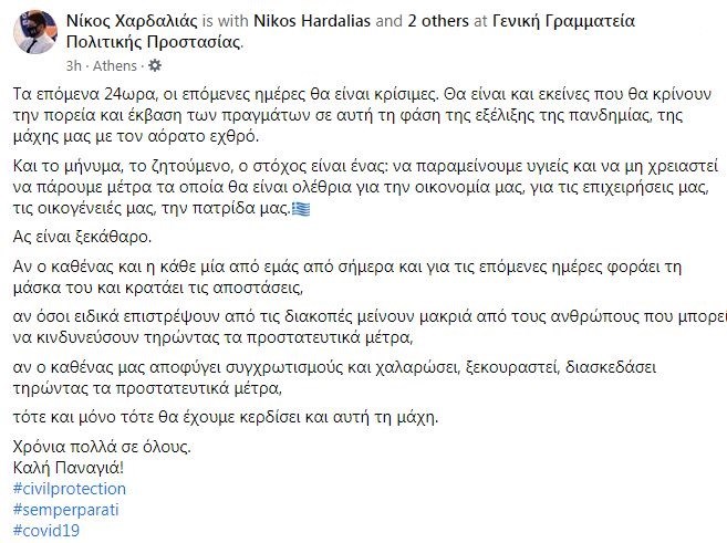 Κρίσιμες χαρακτήρισε τις επόμενες ημέρες ο υφυπουργός Πολιτικής Προστασίας Νίκος Χαρδαλιάς, αναφερόμενος στην εξέλιξη της πανδημίας κορονοϊού. Σε ανάρτησή του στο Facebook, στον απόηχο των νέων μέτρων που ανακοίνωσε την Παρασκευή, σημείωσε ότι τα επόμενα 24ωρα θα κρίνουν την πορεία και έκβαση των πραγμάτων σε αυτή τη φάση της εξέλιξης της πανδημίας.
