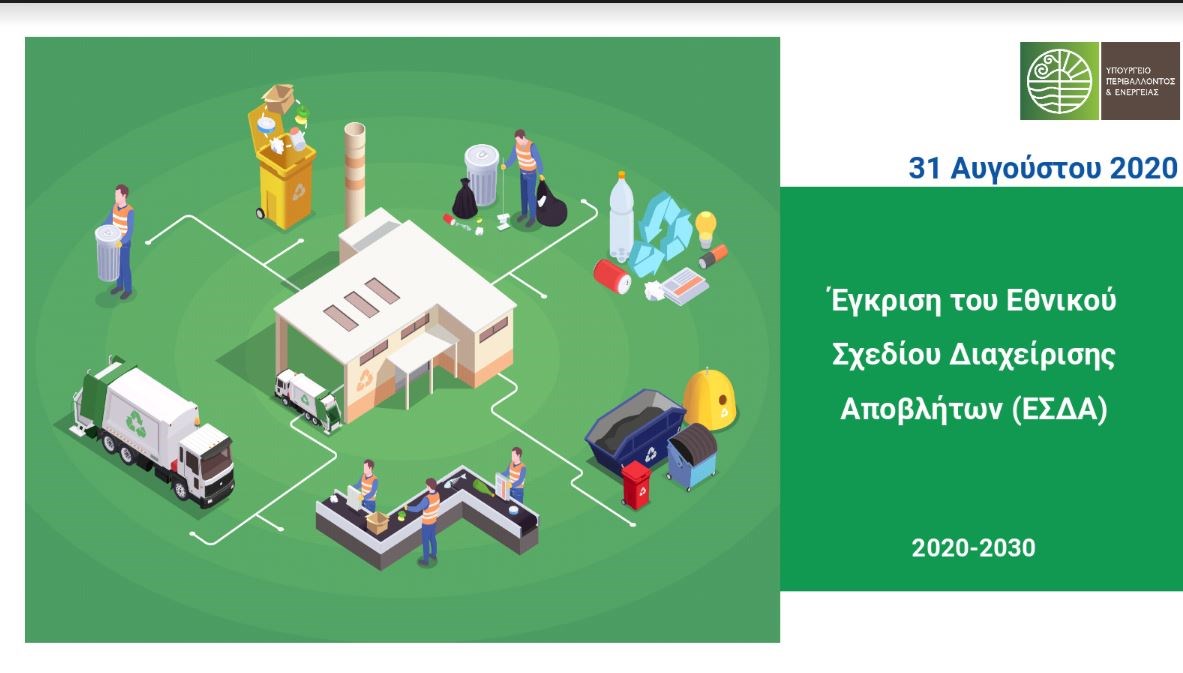 Εγκρίθηκε σήμερα από το Υπουργικό Συμβούλιο -μετά από εισήγηση του υπουργού Περιβάλλοντος και Ενέργειας, Κωστή Χατζηδάκη– το νέο 10ετές Εθνικό Σχέδιο Διαχείρισης Αποβλήτων (ΕΣΔΑ). Σε αυτό ελήφθησαν υπόψη τα σχόλια της διαβούλευσης που υπέβαλαν οι ενδιαφερόμενοι φορείς και οι πολίτες.Βασικοί στόχοι νέου ΕΣΔΑ
