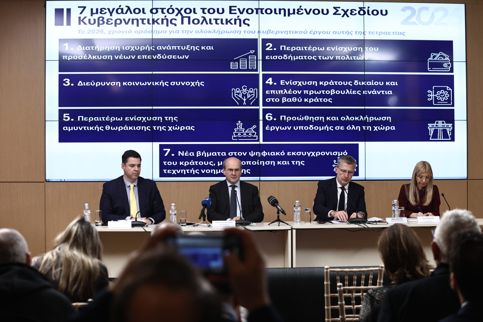 Στη συνέχεια, ο Κωστής Χατζηδάκης κατέθεσε τις βασικές προγραμματικές δεσμεύσεις του 2026. Ξεκίνησε δε, από τους επτά μεγάλους στόχους του Ενοποιημένου Σχεδίου κυβερνητικής πολιτικής:
