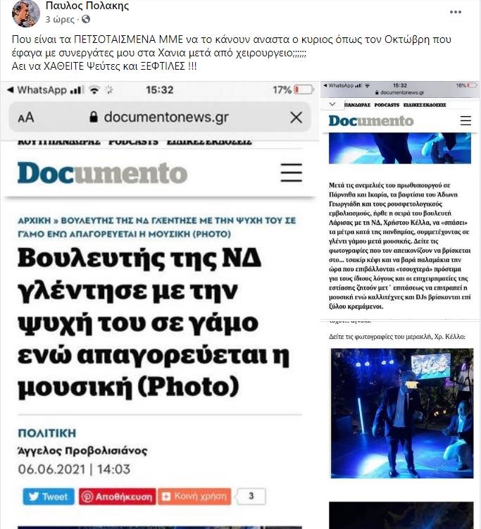 Φωτογραφίες που φέρονται να απεικονίζουν τον βουλευτή Λάρισας της ΝΔ, Χρήστο Κέλλα να συμμετέχει σε γλέντι με μουσική και DJ, δημοσίευσε η ιστοσελίδα του Documento, αναφέροντας στο δημοσίευμα ότι επρόκειτο για γλέντι γάμου μετά μουσικής σε κέντρο. Υπενθυμίζει, δε, ότι πριν από μερικούς μήνες ο κ. Κέλλας είχε δώσει σκληρή μάχη με τον κορονοϊό και είχε διασωληνωθεί.