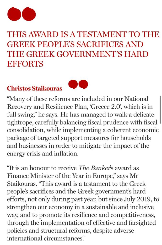 Το βραβείο αυτό αποτελεί επιβράβευση των θυσιών του ελληνικού λαού, της προσαρμοστικότητας και της ανθεκτικότητας των επιχειρήσεων της χώρας, αλλά και της σκληρής προσπάθειας της κυβέρνησης του Κυριάκου Μητσοτάκη. Προσπάθεια όχι μόνο το 2022, αλλά αδιάκοπα από τον Ιούλιο 2019, για ισχυροποίηση της οικονομίας μας με οικονομικά βιώσιμο και κοινωνικά συμπεριληπτικό τρόπο, βελτίωση της ζωής των πολιτών και αναβάθμιση της θέσης της Ελλάδας στη διεθνή σκηνή, μέσα από αποτελεσματικές, διορατικές και μεταρρυθμιστικές πολιτικές.