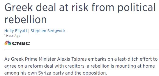 Πολιτική εξέγερση, ανταρσία εντός κι εκτός βουλής, μπορεί να προκαλέσουν τα μέτρα που διαπραγματεύονται Ελλάδα – δανειστές θέτοντας σε κίνδυνο τη σύναψη συμφωνίας, αναφέρει σχόλιο στο CNBC.
