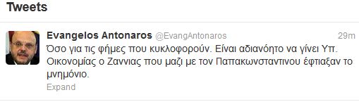 Τις φήμες που κυκλοφορούν και θέλουν να αναλαμβάνει υπουργός Οικονομικών ο Γιώργος Ζανιάς λόγω προβλημάτων υγείας του Βασίλη Ράπανου σχολίασε μέσω Twitter ο πρώην κυβερνητικός εκπρόσωπος της κυβέρνησης Καραμανλής, Ευάγγελος Αντώναρος.”Όσο για τις φήμες που κυκλοφορούν. Είναι αδιανόητο να γίνει Υπ. Οικονομίας ο Ζαννιας που μαζι με τον Παπακωνσταντινου έφτιαξαν το μνημόνιο”, έγραψε ο κ. Αντώναρος.