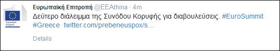 Διεκόπη για δεύτερη φορά η Σύνοδος Κορυφής για διαβουλεύσεις, όπως ανήρτησε στο λογαριασμό της στο Twitter η αντιπροσωπεία της Ευρωπαϊκής Επιτροπής στην Αθήνα.