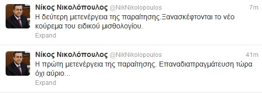 Ο παραιτηθείς υφυπουργός Εργασίας, Νίκος Νικολόπουλος, δε χάνει ευκαιρία να στέλνει “μηνύματα” χρησιμοποιώντας και τα μέσα κοινωνικής δικτύωσης.Ο βουλευτής Αχαΐας, σχολίασε μέσω του προσωπικού λογαριασμού του στο Twitter, το εξής: «Η δεύτερη μετενέργεια της παραίτησης. Ξανασκέφτονται το νέο κούρεμα του ειδικού μισθολογίου». Νωρίτερα, είχε Tweet-άρει: «Η πρώτη μετενέργεια της παραίτησης. Επαναδιαπραγμάτευση τώρα όχι αύριο…».