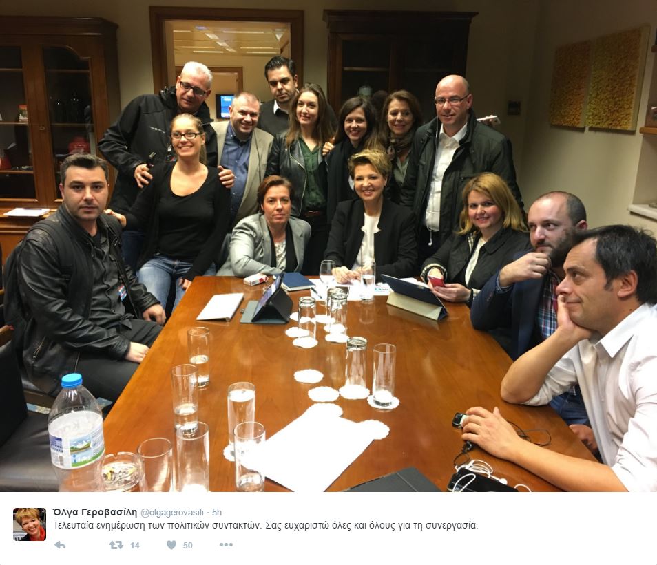 Λίγες ώρες πριν την ανακοίνωση του νέου κυβερνητικού σχήματος έκανε την τελευταία ενημέρωση των πολιτικών συντακτών, με τους οποίους τράβηξε αυτή την αναμνηστική φωτογραφία που ανάρτησε στον προσωπικό της λογαριασμό στο Twitter συνοδεύοντάς την με το μήνυμα: “Τελευταία ενημέρωση των πολιτικών συντακτών. Σας ευχαριστώ όλες και όλους για τη συνεργασία”.