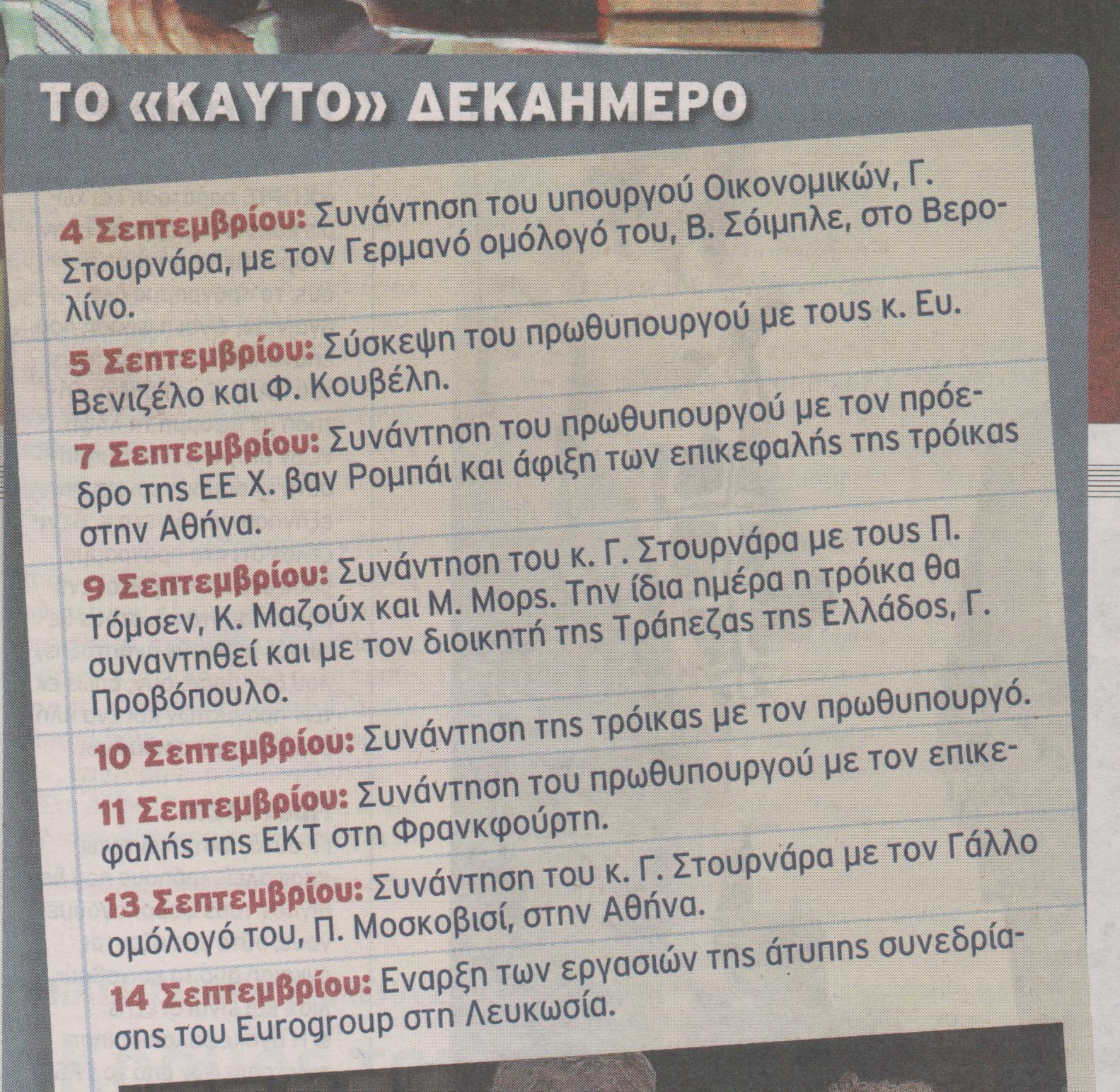 Ο υπουργός Οικονομικών Γιάννης Στουρνάρας ταξ��δεύει στο Βερολίνο για να συναντήσει και να πείσει τον Γερμανό ομόλογό του Βόλφγκανγκ Σόιμπλε να αναθεωρήσει σε ό,τι αφορά την επιμήκυνση του προγράμματος προσαρμογής.Θυμίζουμε ότι παρά την ορατή βελτίωση του κλίματος, ο Σόιμπλε εμφανίζεται ανένδοτος στην άρνηση να συναινέσει στην επιμήκυνση.Ακολουθούν επτά κρίσιμα ραντεβού, εντός κι εκτός Ελλάδας με κρισιμότατη ημερομηνία την 7η Σεπτεμβρίου, οπότε φτάνει η Τρόικα στην Αθήνα και ο πρωθυπουργός Αντώνης Σαμαράς συναντάται με τον πρόεδρο της ΕΕ Χ. φαν Ρομπάι. Ιδού τα ραντεβού:   πηγή: Το ΕθνοςΠΗΓΗ