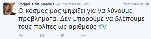 Μέσω του λογαριασμού του στο twitter o υποψήφιος πρόεδρος της ΝΔ, Ευάγγελος Μεϊμαράκης επισημαίνει ότι «ο κόσμος μας ψηφίζει για να λύνουμε προβλήματα».
