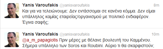 Διαψεύδει μέσω Twitter ο οικονομολόγος Γιάννης Βαρουφάκης τις φήμες που τον ήθελαν να εντάσσεται στο κόμμα του Πάνου Καμμένου.Συγκεκριμένα γράφει:”Και για να τελειώνουμε: Δεν εντάσσομαι σε κανένα κόμμα. Δεν είμαι υπάλληλος καμίας εταιρείας/οργανισμού με πολιτικό ενδιαφέρον. Έγινα σαφής”; Αμέσως πριν είχε γράψει:”Πριν μέρες με θέλανε βουλευτή του Καμμένου. Σήμερα υπάλληλο των Soros και Roubini. Αύριο τι θα σκαρφιστούν”;