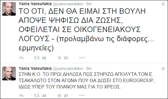 “Το ότι δεν θα είμαι στη βουλή απόψε να ψηφίσω δια ζώσης, οφείλεται σε οικογενειακούς λόγους – οφείλεται σε οικογενειακούς λόγους -((προλαμβάνω τις διάφορες… ερμηνείες)” έγραψε ο κ. Βαρουφάκης στο λογαριασμό του.