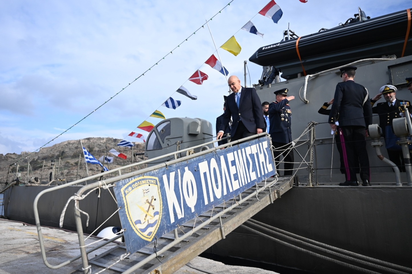 Ακολούθως ο Υπουργός Εθνικής Άμυνας μετέβη στην Κανονιοφόρο του Πολεμικού Ναυτικού «ΠΟΛΕΜΙΣΤΗΣ» που ναυλοχεί στο λιμάνι της Μύρινας, όπου αντάλλαξε επίσης ευχές με τον Διοικητή του Ναυτικού Σταθμού Λήμνου Πλοίαρχο Βασίλειο Παππά ΠΝ, τον Κυβερνήτη της Κανονιοφόρου Πλωτάρχη Ραδάμανθυ Βοσκάκη ΠΝ και τα μέλη του πληρώματος.