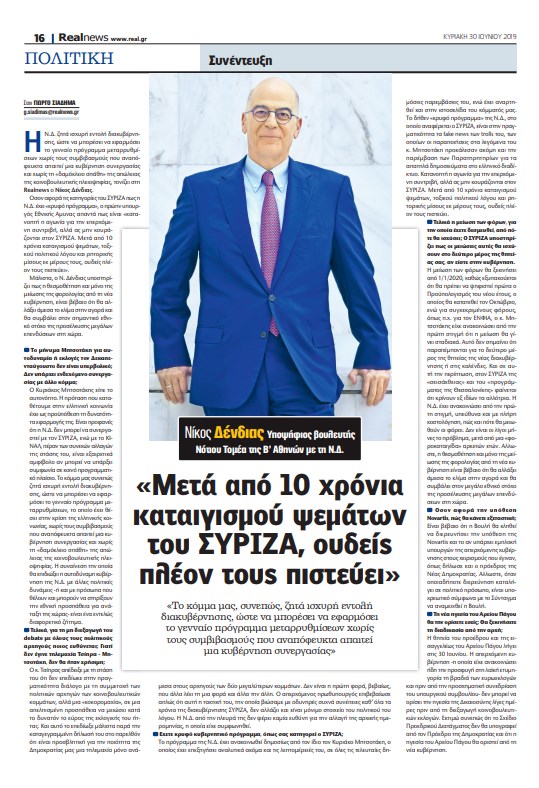 Η Ν.Δ. ζητά ισχυρή εντολή διακυβέρνησης, ώστε να μπορέσει να εφαρμόσει το γενναίο πρόγραμμα μεταρρυθμίσεων χωρίς τους συμβιβασμούς που αναπόφευκτα απαιτεί μια κυβέρνηση συνεργασίας και χωρίς τη «δαμόκλειο σπάθη» της απώλειας της κοινοβουλευτικής πλειοψηφίας, τονίζει στη Realnews ο Νίκος Δένδιας.
