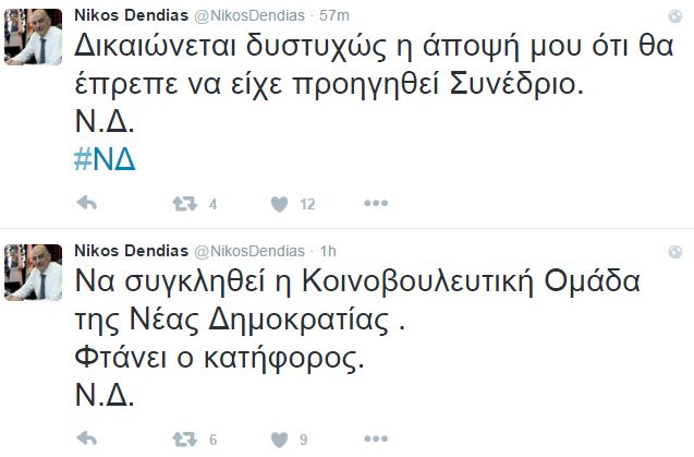 “Να συγκληθεί η Κοινοβουλευτική Ομάδα της Νέας Δημοκρατίας . Φτάνει ο κατήφορος” γράφει ο Νίκος Δένδιας στο Twitter και προσθέτει: