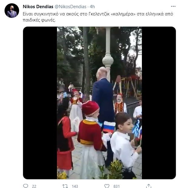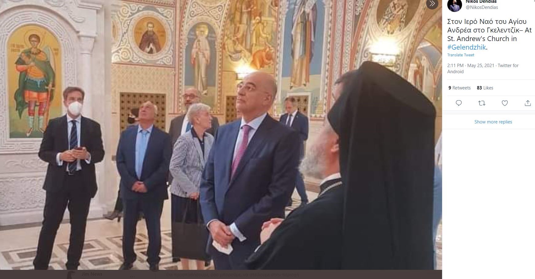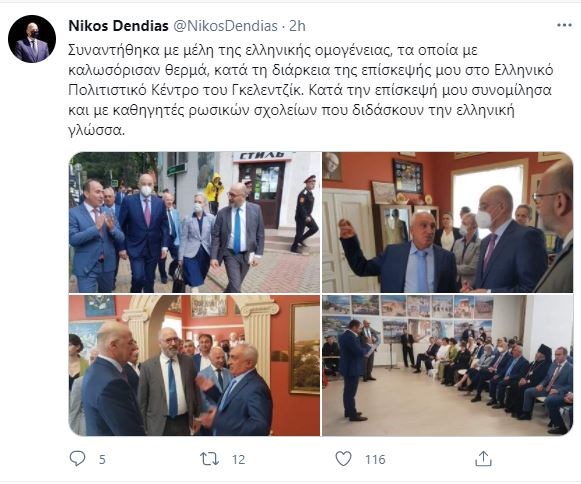 Το Ελληνικό Πολιτιστικό Κέντρο του Γκελεντζίκ που βρίσκεται στα παράλια του Βορείου Ευξείνου Πόντου, επισκέφθηκε την Τρίτη ο υπουργός Εξωτερικών, Νίκος Δένδιας, ο οποίος σε ανάρτησή του στο Twitter ανέφερε ότι «συναντήθηκα με μέλη της ελληνικής ομογένειας, τα οποία με καλωσόρισαν θερμά, κατά τη διάρκεια της επίσκεψής μου στο Ελληνικό Πολιτιστικό Κέντρο του Γκελεντζίκ. Κατά την επίσκεψή μου συνομίλησα και με καθηγητές ρωσικών σχολείων που διδάσκουν την ελληνική γλώσσα».