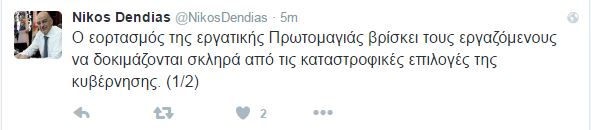 «Ο εορτασμός της εργατικής Πρωτομαγιάς βρίσκει τους εργαζόμενους να δοκιμάζονται σκληρά από τις καταστροφικές επιλογές της κυβέρνησης», έγραψε στο Twitter, ο Νίκος Δένδιας.