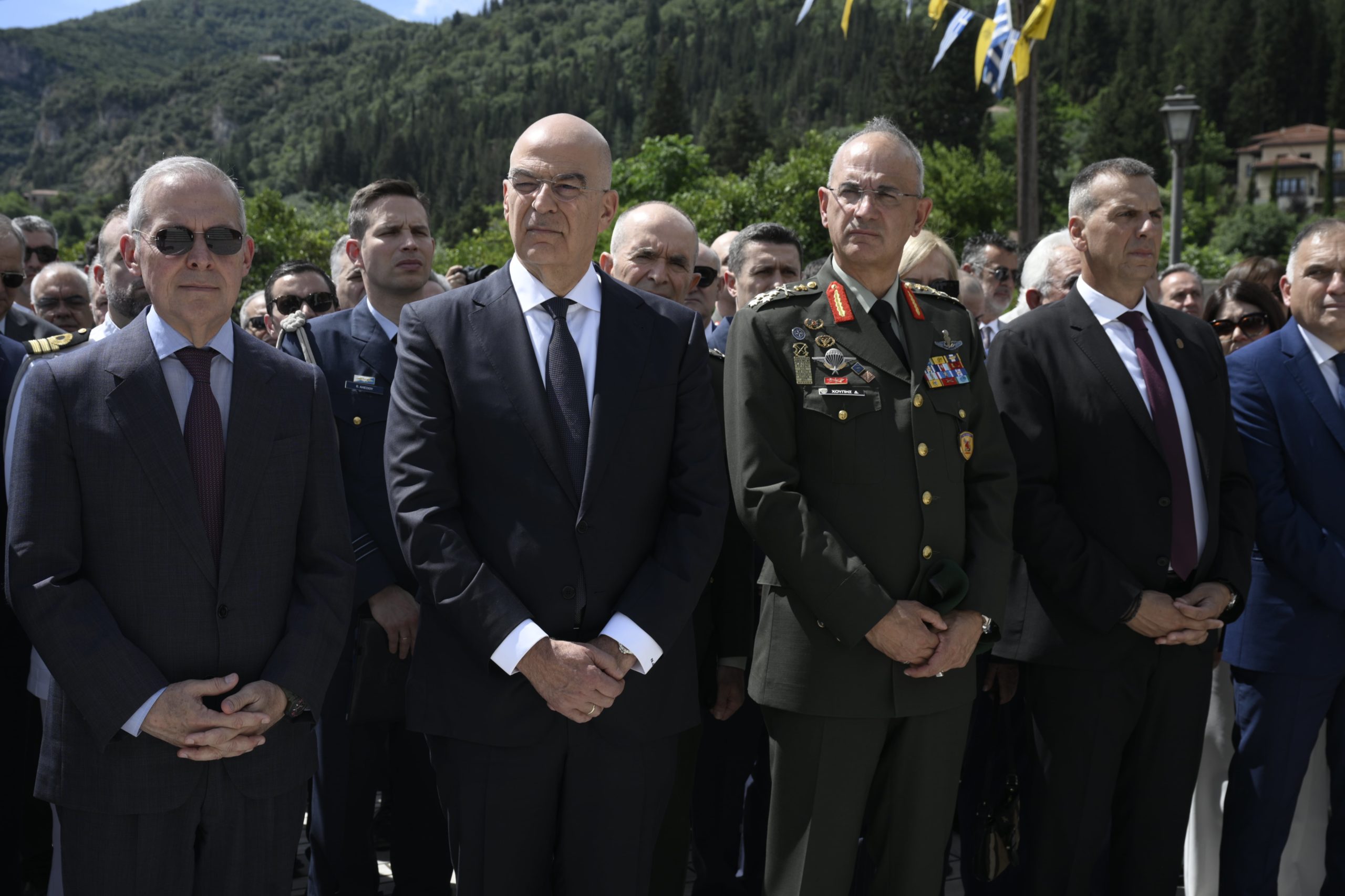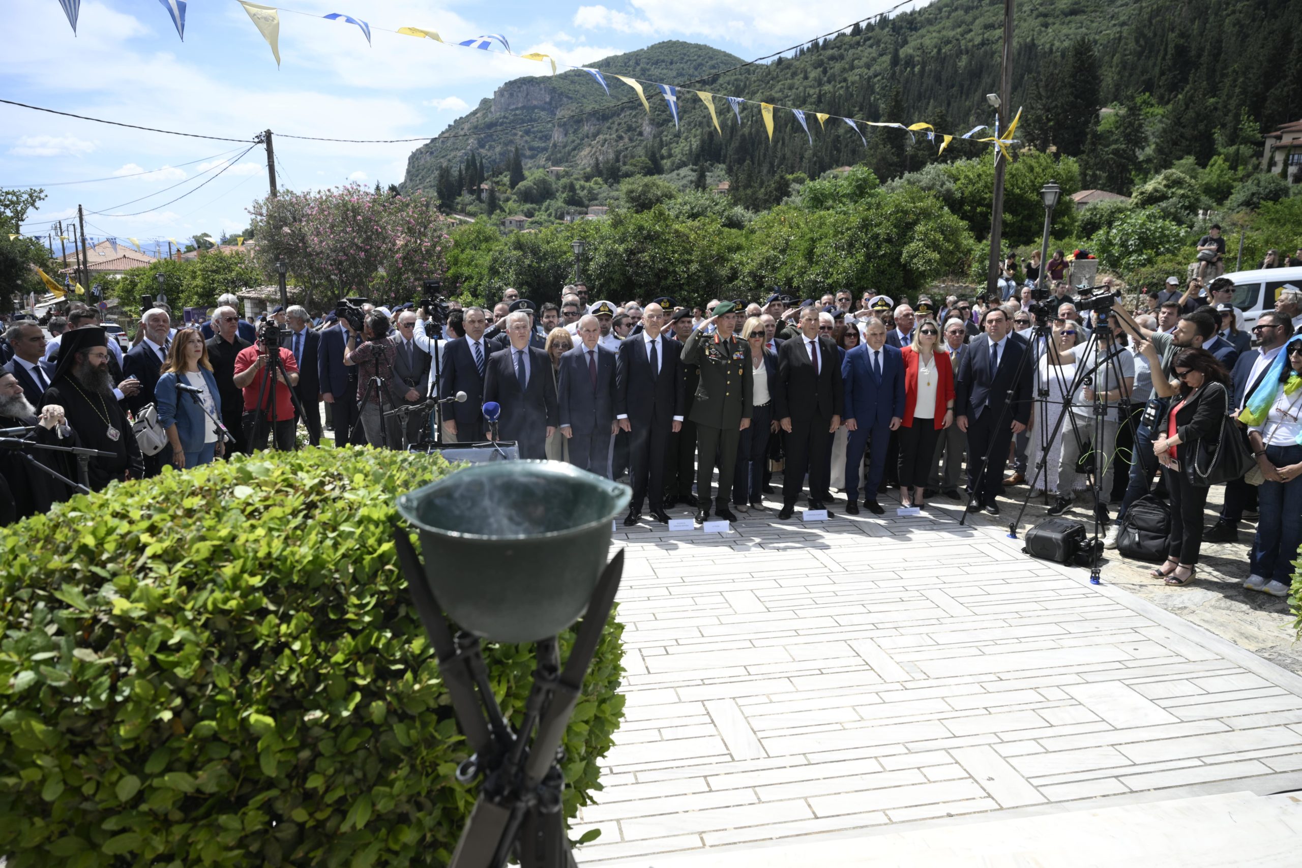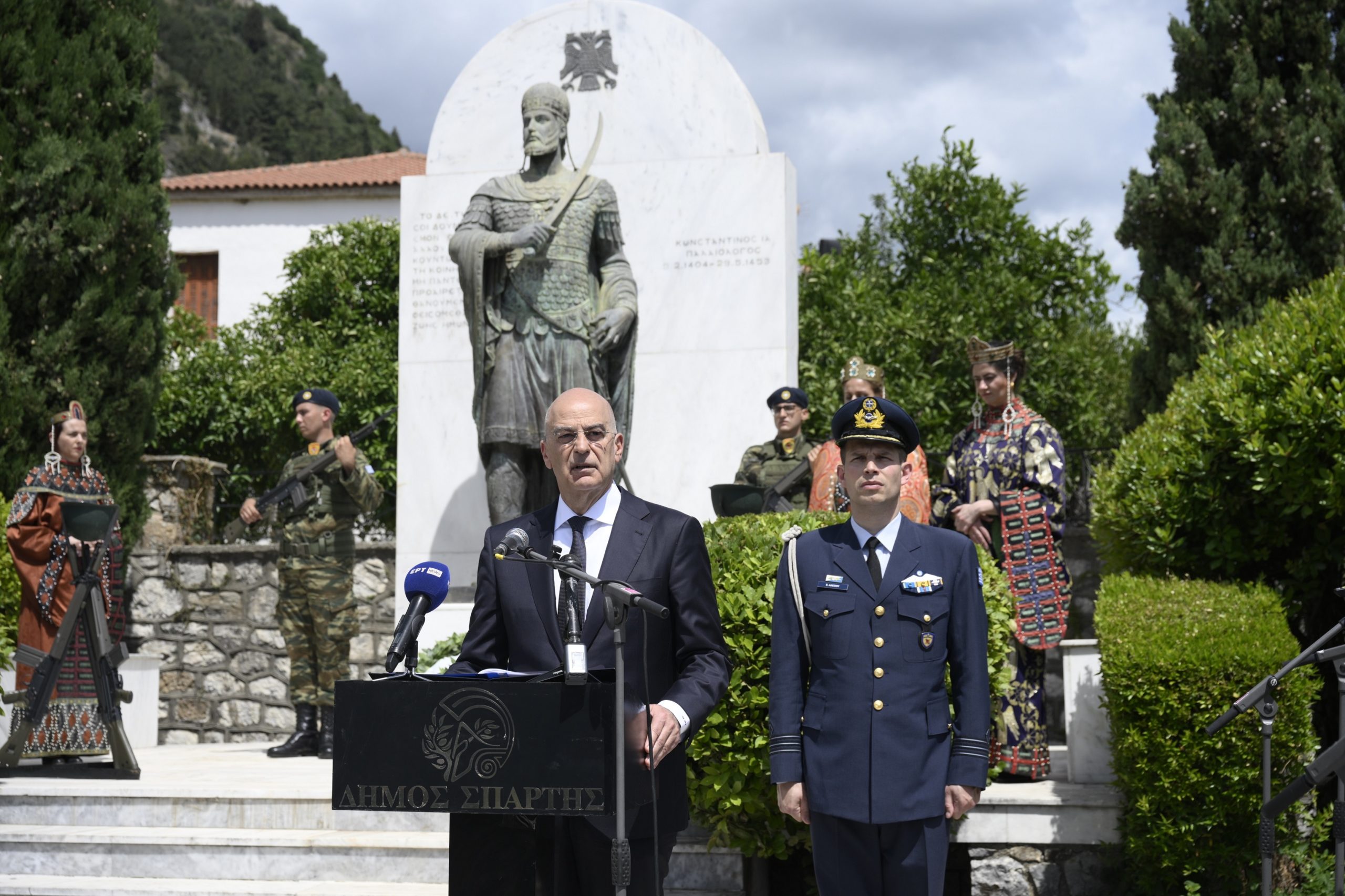 Στη συνέχεια, ο κ. Δένδιας μετέβη στον ανδριάντα του Κωνσταντίνου Παλαιολόγου, στην πλατεία της κοινότητας Μυστρά, όπου τελέστηκε τρισάγιο. Ακολούθησε κατάθεση στεφάνων.