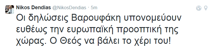 «Οι δηλώσεις Βαρουφάκη υπονομεύουν ευθέως την ευρωπαϊκή προοπτική της χώρας. Ο Θεός να βάλει το χέρι του!», έγραψε ο κ. Δένδιας.