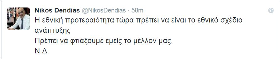«Η εθνική προτεραιότητα τώρα πρέπει να είναι το εθνικό σχέδιο ανάπτυξης» γράφει ο βουλευτής της ΝΔ, Νίκος Δένδιας, στον προσωπικό του λογαριασμό στο twitter, και προσθέτει: