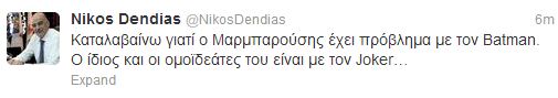 Δένδιας σε Μπαρμπαρούση: Είσαι με τον Joker Enikos Newsroom 11:18, Τετάρτη 21 Νοεμβρίου 2012 πολιτική Δένδιας σε Μπαρμπαρούση: Είσαι με τον Joker “Καταλαβαίνω γιατί ο Μπαρμπαρούσης έχει πρόβλημα με τον Batman” γράφει στο twitter ο υπουργός Δημόσιας Τάξης Νίκος Δένδιας.. BATMAN KΩΣΤΑΣ ΜΠΑΡΜΠΑΡΟΥΣΗΣ TWITTER ΔΕΝΔΙΑΣ ΝΙΚΟΣ ΔΕΝΔΙΑΣ Μοιράσου το: σχολίασε κι εσύ (0 σχόλια) Ακολουθήστε το enikos.gr στο Google News και μάθετε πρώτοι όλες τις ειδήσεις Δείτε όλες τις τελευταίες ειδήσεις από την Ελλάδα και τον Κόσμο στο enikos.gr Ειδήσεις Ροή Ειδήσεων 26 λεπτά πριν Live – Έξοδος Χριστουγέννων: Αυξημένη η κίνηση στις Εθνικές Οδούς – Εικόνα αποσυμφόρησης με νέες λωρίδες κυκλοφορίας στα αγροτικά μπλόκα 44 λεπτά πριν Ο Ζελένσκι παρουσίασε νέο ειρηνευτικό σχέδιο 20 σημείων για τον τερματισμό του πολέμου στην Ουκρανία 2 ώρες πριν Τουρκία: Αναφορές για Ελληνίδα αεροσυνοδό στο αεροσκάφος που συνετρίβη με τον αρχηγό του Γενικού Επιτελείου της Λιβύης 2 ώρες πριν Καιρός: Βροχές και καταιγίδες σήμερα στο μεγαλύτερο μέρος της χώρας – Πώς θα κάνουμε Χριστούγεννα, τα δεδομένα για την Πρωτοχρονιά 2 ώρες πριν Φρίκη στη Θεσσαλονίκη: 13χρονη κατήγγειλε ότι έπεσε θύμα ομαδικού βιασμού από 6 αγόρια 2 ώρες πριν Η ζωή για 3 ζώδια γίνεται πολύ πιο εύκολη από εδώ και πέρα – «Εμπιστευτείτε τη διαίσθηση σας για να πάρετε αποφάσεις» 3 ώρες πριν Αγρότης ανακάλυψε τυχαία λείψανα δύο ανθρώπων της Εποχής του Χαλκού – Το μυστήριο πίσω από την περίεργη ταφή 2 ώρες πριν Χαμός στο διαδίκτυο με ανάρτηση μητέρας για όσους δεν έχουν παιδιά – «Κάνουν διακοπές κάθε μέρα» 1 ημέρα πριν Η Coca-Cola και ο Ελληνικός Ερυθρός Σταυρός μαζί αυτά τα Χριστούγεννα: Μια μεγάλη αγκαλιά για τους συνανθρώπους μας που έχουν ανάγκη 6 λεπτά πριν Δημήτρης Κουτσούμπας: Άκουσε ηπειρώτικα κάλαντα και έσυρε τον χορό – Βίντεο 16 λεπτά πριν Κύκλωμα διακίνησης ναρκωτικών σε σχολεία: Στη φυλακή οι 12 κατηγορούμενοι 22 λεπτά πριν Γιώργος Καπουτζίδης: Το μήνυμα μετά το reunion του «Παρά Πέντε» – «Να αγκαλιαζόμαστε, να αγαπάμε, να νοιαζόμαστε…» 26 λεπτά πριν Live – Έξοδος Χριστουγέννων: Αυξημένη η κίνηση στις Εθνικές Οδούς – Εικόνα αποσυμφόρησης με νέες λωρίδες κυκλοφορίας στα αγροτικά μπλόκα 33 λεπτά πριν Γυναίκα που έχασε 30 κιλά αποκαλύπτει τα μυστικά της επιτυχίας της – «Οι υδατάνθρακες είναι καύσιμο του οργανισμού, όχι εχθρός» ENIKOS NETWORK Στο επίκεντρο οι ανάγκες των ατόμων με διαβήτη-Τρεις προτάσεις προς τον ΕΟΦ Πόνος στην κοιλιά στους άνδρες: Με ποιες παθήσεις μπορεί να σχετίζεται Τραπέζι των Χριστουγέννων: Χρήσιμες οδηγίες από τον ΕΦΕΤ για τους καταναλωτές Χριστούγεννα: Πόσα χρήματα θα πάρουν αύριο και μεθαύριο οι εργαζόμενοι Ο Google Assistant θα παραμείνει λίγο περισσότερο για ορισμένους χρήστες Android Τεστ προσωπικότητας: Το βάζο που θα επιλέξετε αποκαλύπτει πώς λύνετε προβλήματα στη ζωή σας περισσότερα 11:31 , Τετάρτη 24 Δεκεμβρίου 2025 Δημήτρης Κουτσούμπας: Άκουσε ηπειρώτικα κάλαντα και έσυρε τον χορό – Βίντεο Η Αδελφότητα Αθηνών Αγίας Παρασκευής Κόνιτσας – Το «Κεράσοβο» και το συγκρότημα του Νίκο... 10:29 , Τετάρτη 24 Δεκεμβρίου 2025 ΣΥΡΙΖΑ: Το 2025 απέδειξε ότι ο πρωτογενής τομέας έχει τεθεί στο περιθώριο των κυβερνητικών επιλογών Σφοδρή κριτική στην κυβερνητική πολιτική για τον πρωτογενή τομέα ασκεί το τμήμα Αγροτικής Πολι... 10:01 , Τετάρτη 24 Δεκεμβρίου 2025 Κυρανάκης: Τι αλλάζει στον σιδηρόδρομο έως το 2027 Στην αναθεώρηση της σύμβασης Ελληνικού Δημοσίου – Hellenic Train αναφέρθηκε ο αναπλ