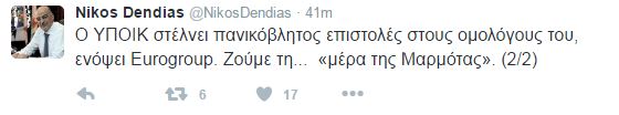 Με δεύτερη ανάρτηση του κ. Δένδιας, επιτέθηκε στον Ευκλείδη Τσακαλώτο, γράφοντας χαρακτηριστικά: “ Ο ΥΠΟΙΚ στέλνει πανικόβλητος επιστολές στους ομολόγους του, ενόψει Eurogroup. Ζούμε τη «μέρα της Μαρμότας»”.