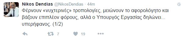 Επίθεση στον υπουργό Εργασίας, Γιώργο Κατρούγκαλο και στον υπουργό Οικονομικών Ευκλείδη Τσακαλώτο, εξαπέλυσε ο βουλευτής της Νέας Δημοκρατίας, Νίκος Δένδιας, με αναρτήσεις που έκανε νωρίτερα στον προσωπικό του λογαριασμό στο Twitter, επισημαίνοντας ότι ζούμε τη «μέρα της Μαρμότας». Συγκεκριμένα, ο κ. Δένδιας έγραψε: “Φέρνουν «νυχτερινές» τροπολογίες, μειώνουν το αφορολόγητο και βάζουν επιπλέον φόρους, αλλά ο Υπουργός Εργασίας δηλώνει… υπερήφανος”.