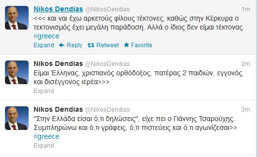 “Στην Ελλάδα είσαι ό,τι δηλώσεις”, είχε πει ο Γιάννης Τσαρούχης. Συμπληρώνω και ό,τι γράφεις, ό,τι πιστεύεις και ό,τι αγωνίζεσαι, έγραψε πριν από λίγο ο υπουργός Δημοσίας Τάξης και Προστασίας του Πολίτη , απαντώντας εμμέσως πλην σαφώς στον Ηλία Κασιδιάρη ο οποίος είπε πως ο Νίκος Δένδιας είναι “Δικηγόρος των Rothschild, άνθρωπος των εβραίων και τέκτων υψηλού βαθμού”.