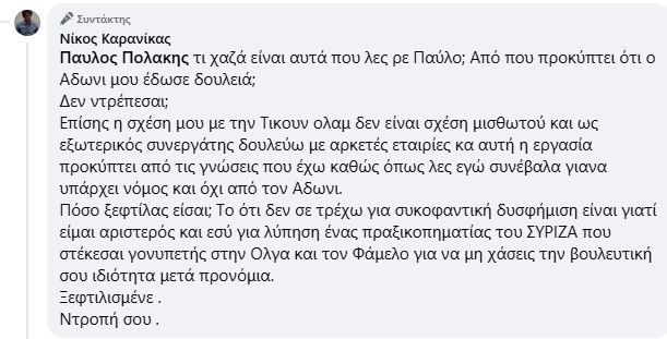 Το σχόλιο του Παύλου Πολάκη δεν έμεινε αναπάντητο από τον Νίκο Καρανίκα, ο οποίος ανέφερε: «πόσο ξεφτίλας είσαι;». Έγραψε, ότι δεν τον «τρέχει» για συκοφαντική δυσφήμιση γιατί «είμαι αριστερός κι εσύ για λύπηση ένας πραξικοπηματίας του ΣΥΡΙΖΑ», που «στέκεσαι γονυπετής» στην Όλγα Γεροβασίλη και τον Σωκράτη Φάμελλο «για να μην χάσεις την βουλευτική σου ιδιότητα με τα προνόμια». «Ξεφτιλισμένε, ντροπή σου», καταλήγει ο Νίκος Καρανίκας.