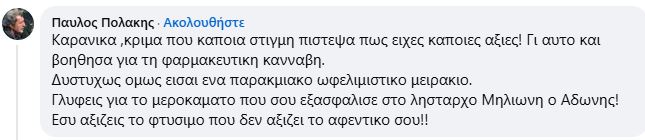 Η τοποθέτηση του Νίκου Καρανίκα προκάλεσε την αντίδραση του Παύλου Πολάκη, ο οποίος σχολίασε κάτω από την επίμαχη ανάρτηση χαρακτηρίζοντάς τον ως «παρακμιακό ωφελιμιστικό μειράκιο», ενώ άφησε αιχμές για την επαγγελματική δραστηριότητά του.