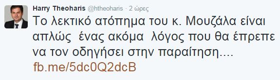 Ο Χάρης Θεοχάρης με ανάρτηση στα κοινωνικά δίκτυα όπου παραθέτει την ακριβή αναφορά του, σχολίασε: «Tο λεκτικό ατόπημα του κ. Μουζάλα είναι απλώς ένας ακόμα λόγος που θα έπρεπε να τον οδηγήσει στην παραίτηση. Διπλωματικά σαρδάμ δεν υφίστανται».