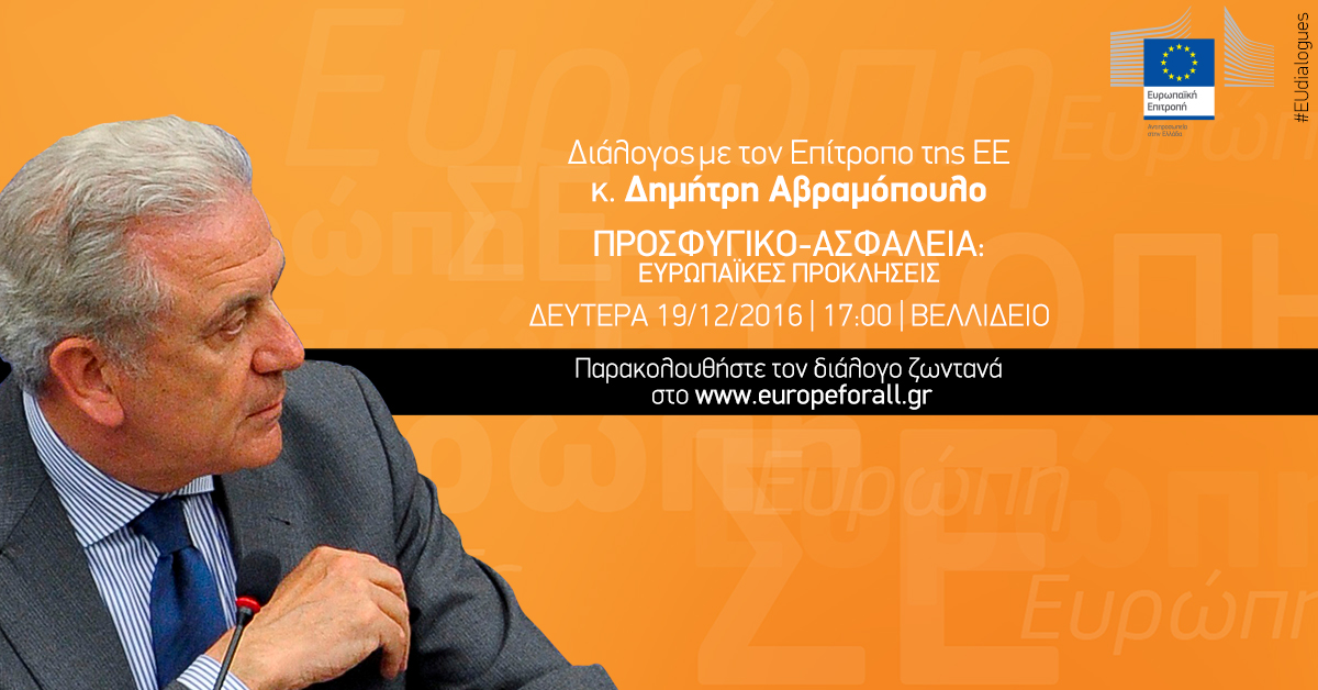Η Αντιπροσωπεία της Ευρωπαϊκής Επιτροπής στην Ελλάδα διοργανώνει «Διάλογο με τους Πολίτες» με τον Ευρωπαίο Επίτροπο, κ. Δημήτρη Αβραμόπουλο, αρμόδιο για τη μετανάστευση, τις εσωτερικές υποθέσεις και την ιθαγένεια, τη Δευτέρα 19 Δεκεμβρίου 2016, ώρα 17:00, στο Βελλίδειο Συνεδριακό Κέντρο, στη Θεσσαλονίκη, με θέμα «Προσφυγικό – Ασφάλεια: Ευρωπαϊκές Προκλήσεις».