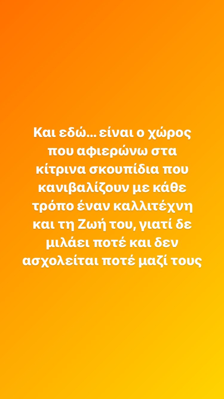 «Κι εδώ… είναι ο χώρος που αφιερώνω στα κίτρινα σκουπίδια που κανιβαλίζουν με κάθε τρόπο έναν καλλιτέχνη και τη Ζωή του, γιατί δεν μιλάει ποτέ και δεν ασχολείται ποτέ μαζί τους» έγραψε σε μια από τις αναρτήσεις ο Διαμαντής Καραναστάσης.