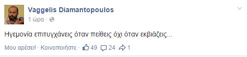 «Ηγεμονία επιτυγχάνεις όταν πείθεις όχι όταν εκβιάζεις», γράφει στην προσωπική του σελίδα στο Facebook, ο βουλευτής του ΣΥΡΙΖΑ, Βαγγέλης Διαμαντόπουλος, ενώ με ανάρτηση που είχε κάνει λίγο νωρίτερα σημείωνε ότι τον θλίβει η ανθρωποφαγία εντός της κοινοβουλευτικής ομάδας. Συγκεκριμένα, ο Διαμαντόπουλος έγραψε: