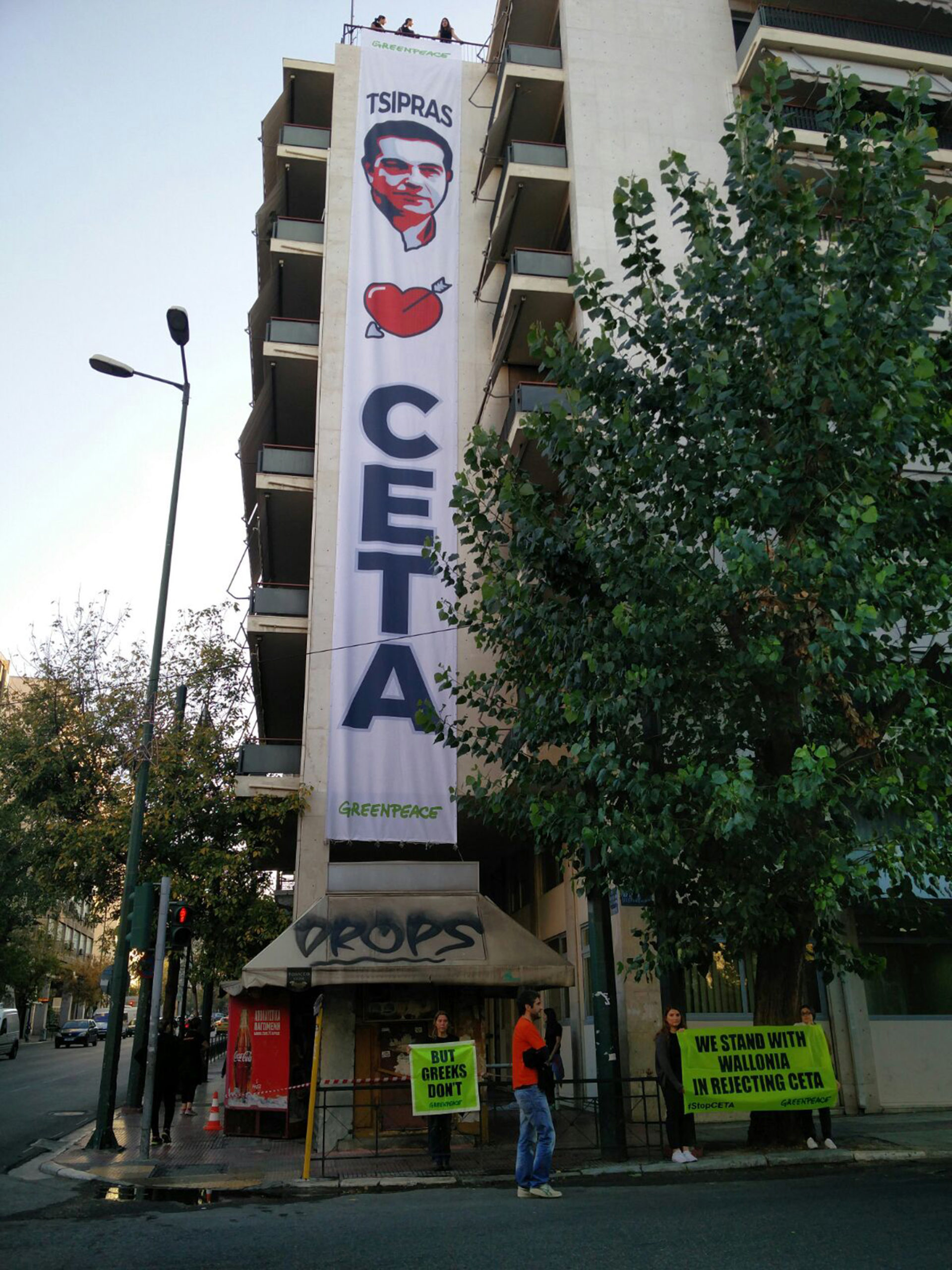 Οι ακτιβιστές έχουν κρεμάσει πανό από την ταράτσα με το μήνυμα «Ο Τσίπρας αγαπά τη CETA – Οι Έλληνες όχι», ενώ κρατούν και πανό με το μήνυμα «Η Ceta έρχεται – Η ελπίδα φεύγει», λίγες ημέρες αφού η περιφέρεια της Βαλλονίας στο Βέλγιο μπλόκαρε την υπογραφή της συμφωνίας από την Ευρωπαϊκή Ένωση και τον Καναδά.