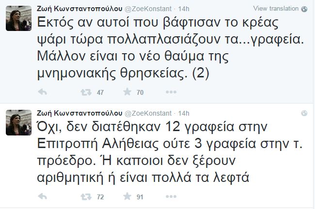 Η πρώην πρόεδρος της Βουλής, Ζωή Κωνσταντοπούλου, διέψευσε με δύο tweet ότι διέθεσε δώδεκα γραφεία στην Επιτροπή Αλήθειας Δημόσιου Χρέους, με χθεσινή της απόφαση.